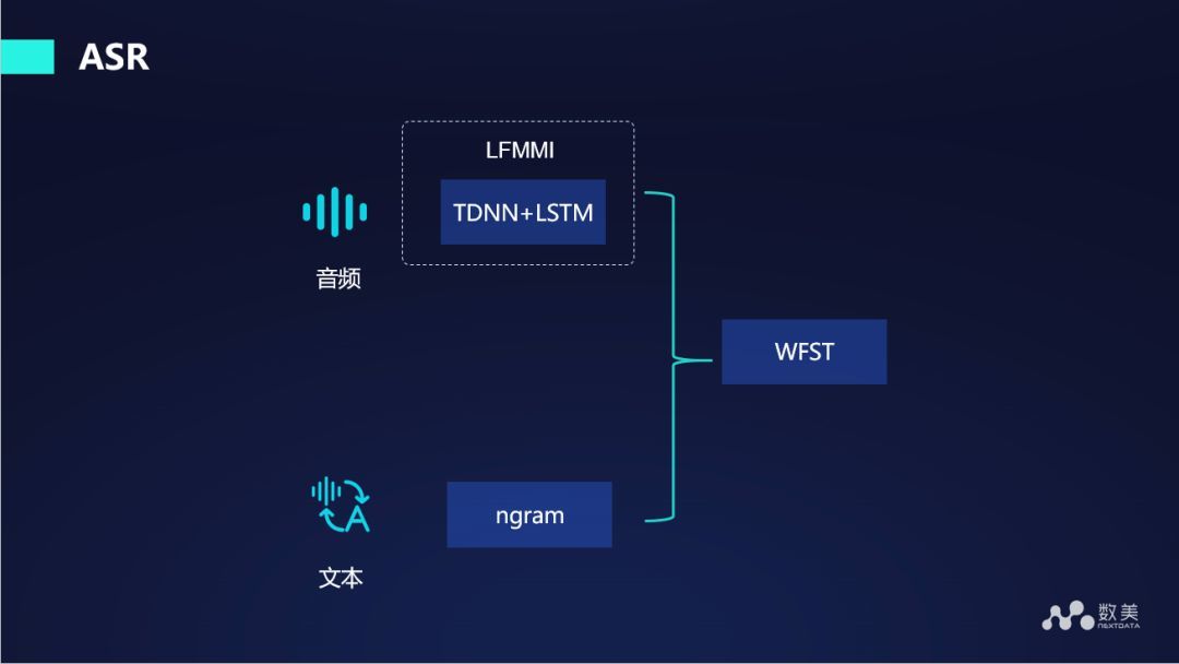 在语音转写文字的过程中,采用 DNN+LSTM,然后使用 lattice-free MMI 方法训练现有模型,我们使用的语言模型是 ngram 方式。这是一个相对比较主流的框架。目前 ASR 主要解决的是把音频中的文字提取出来。