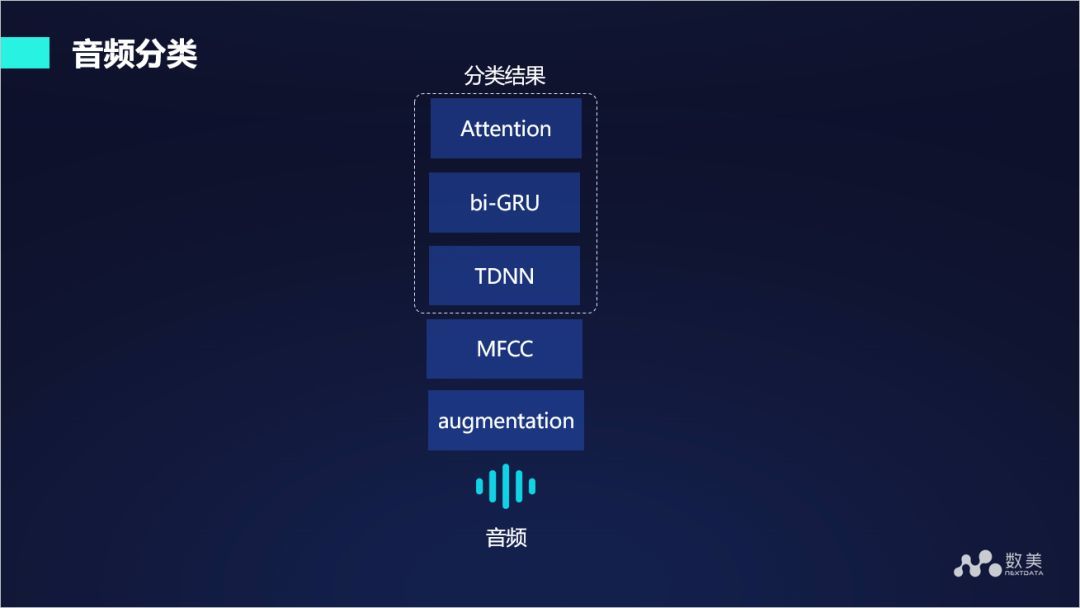 前面我们提到还有一部分语音识别不能通过转文字获得。比如是否有音乐,播放音乐的名称,是否存在色情声音等等。我们采用声音分类的框架来解决这个问题。首先需要对音频进行数据增强,因为在音频分类条件下数据的 label 并不均衡,特别是存在一些小众的声音,非常稀少,所以需要对这些数据进行增强。我们使用 TDNN+bi-GRU+Attention 框架。
