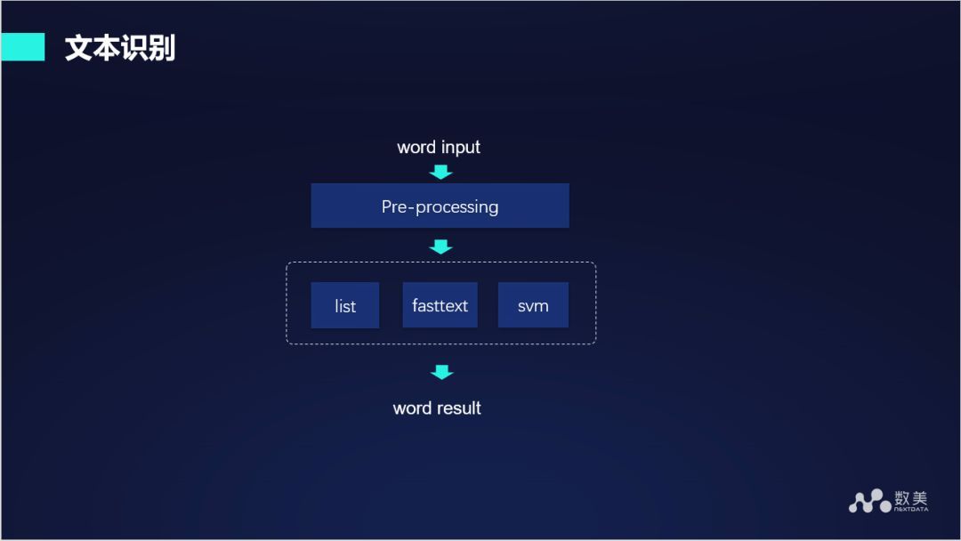 上述第一步将音频转换成文字,第二步将分类信息标签集,第三步需要对转换出来的文字进行文字识别,文字识别主要包括文字的分类:基于一段文字判断它所属的类别,比如这段文字是不是属于色情话题或者是带有辱骂性等。模型不能完全解决这方面的问题,还需要有关键词类比。我们给出的框架通过 fasttext 模型或者一些传统的机器学习算法来进行模型分类,同时联合关键词信息进行处理。在使用模型训练之前首先对文本进行预处理,比如分词、归一化等。