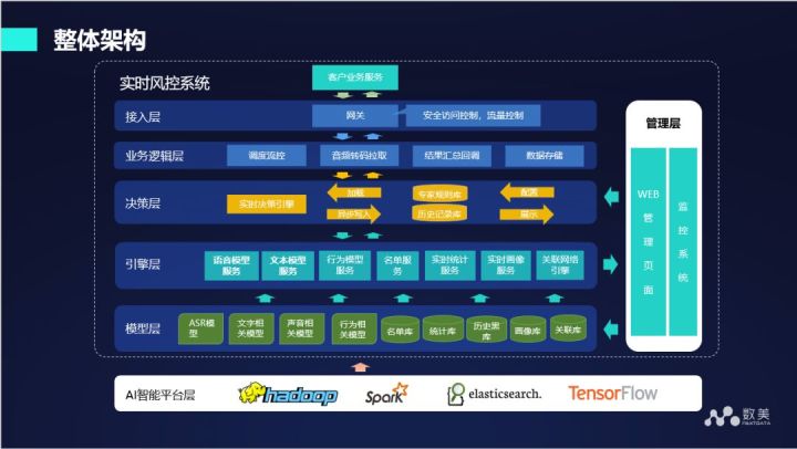 下图是我们整个框架的架构图,将上述我们分析的各个模块整合在一起。在模型层面包括 ASR 模型、文字相关模型、声音相关模型、行为相关模型、名单库等。通过引擎层输出各种各样的分数,最后我们有一套规则,规则引擎会对所有模型层面和画像层面输出的结果进行汇总,最终得到结论。