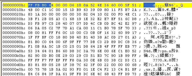 前面的四个字节为“FF FB B0 64”对应的二进制串为“11111111 11111011 10110000 01100100”,参照前面的分析,第16位为“1”,则无校验数据;第17至20位为“1011”,则比特率=192kbps;第21至22位为“00”,则采样频率=44.1kHz;第23位为“0”,则帧长调整是0;所以帧长Size=144*192/44.1+0=626,前面除法需向下求整(但有时又是四舍五入)。所以在地址0x272处又开始了新的帧,我这里是“FF FB B0 44”。