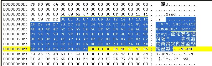 规律说明:根据上表的分析,所有的Mp3文件的数据帧开始的两个字节必需是“FF FA”或者 “FF FB”。