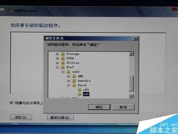 装入光盘后,点击“浏览”,选择光盘下的USB 3.0驱动。具体文件位置为:Win7/usb3/Intel/x64(X86),如果你安装的是64位Windows 7就选择X64,32位Windows 7就选择X86。