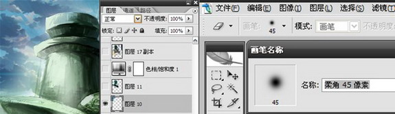4.由于这张画要画的地方比较多,画起来也比较麻烦,所以有时候我会借助贴图来减轻绘画的负担。先铺一些贴图做底子,在贴图上绘制能轻松一点。天空的贴图,贴上去后看着比较舒服,直到最后都没有替换,这里算是偷懒了吧,呵呵!以后我会尽量自己来画,克服惰性。天空的贴图用的是正常模式,为了让贴图与画面融合得更好,我把主体遮挡的部分用橡皮擦掉了,这里橡皮用的是柔角橡皮。