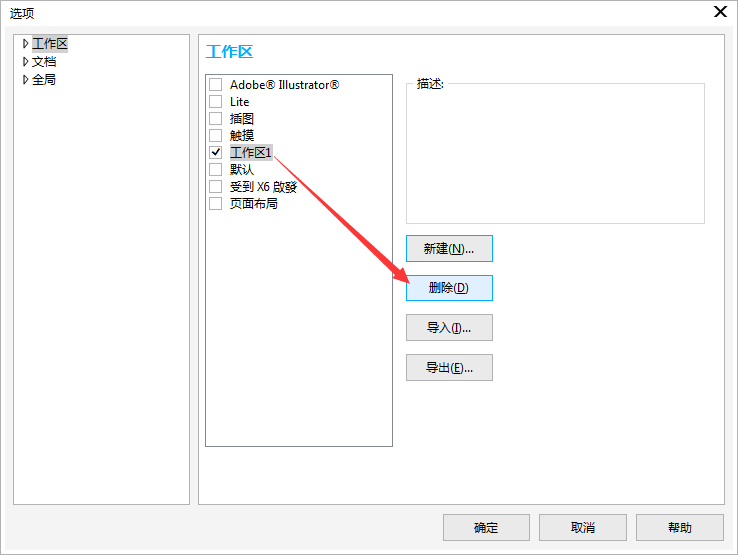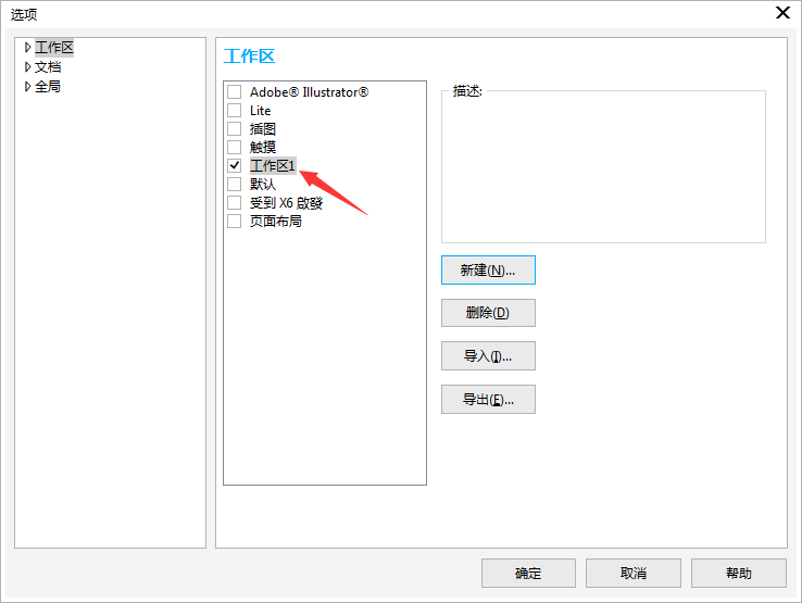 1. 执行菜单栏的“工具>选项”(快捷键Ctrl+J),在弹出的“选项”对话框的左侧栏中点击“工作区”类型列表,面板右侧单击“新建”命令。
