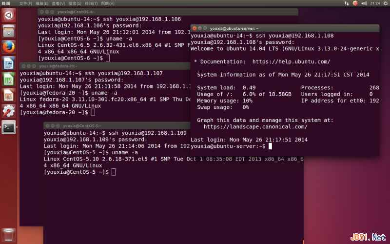 从这个截图可以看出,我为了“折腾”Linux系统,在我的电脑上安装的5个不同的发行版。它们分别是Ubuntu 14.04桌面版、CentOS 5.10、CentOS 6.5、Fedora 20和一个Ubuntu 14.04 Server版。在以上所有系统中,只有Ubuntu 14.04桌面版和Fedora 20开启了GUI,其它的几个系统都使用字符界面。上面的截图就是我在Ubuntu 14.04桌面版中,使用ssh远程连接到另外四个系统时的情形。