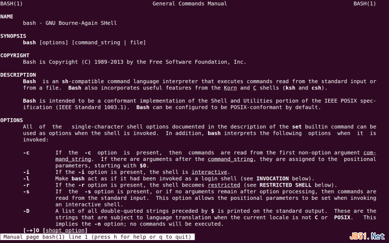 Linux就是一座宝藏,其中有汗牛充栋的精心编写的文档,一辈子都学不完。要发掘这座宝藏,有两把钥匙必不可少,它们就是man和info。比如,想学习bash编程,可以尝试输入man bash来查看bash的文档,如下图(后面的截图都是将gnome-terminal全屏后的效果,完全模拟全文本界面,没有设置半透明背景):