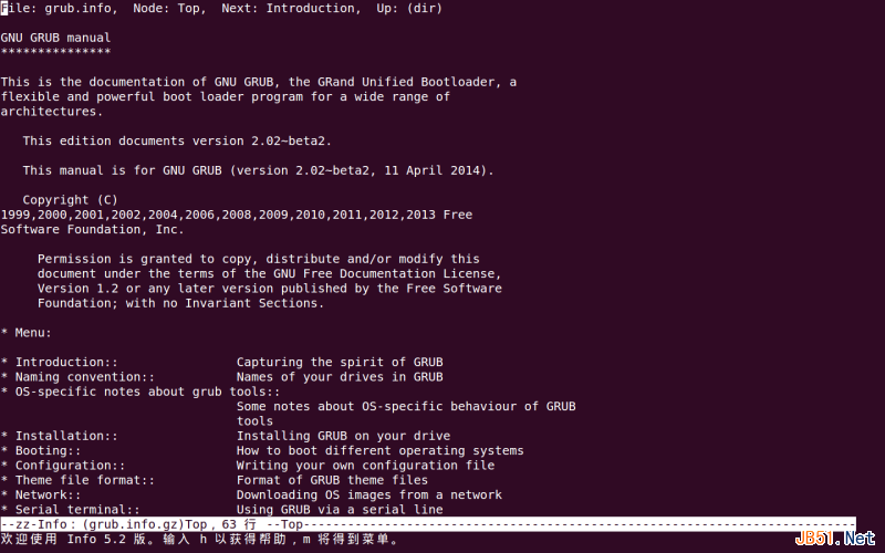 而对于GNU出品的软件,往往都提供info格式的文档,可以通过info命令阅读。例如,想了解Grub怎么安装和配置,可以输入info grub查看其文档,如下图: