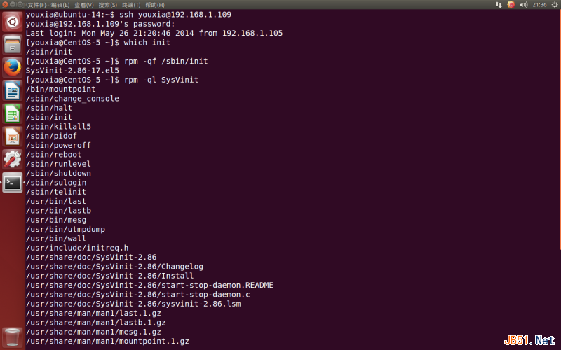 在Red Hat流派的系统(CentOS、Fedora)中,软件的包管理器是RPM。先看CentOS 5.10,首先,使用which init命令,可以查出init的完整路径为/sbin/init;然后使用rpm -qf /sbin/init命令,可以查出init程序所在的软件包为SysVinit;最后,使用rpm -ql SysVinit命令,就可以看到这个软件包里面还有哪些程序、哪些文档以及它们分别位于文件系统的什么地方了,如下图: