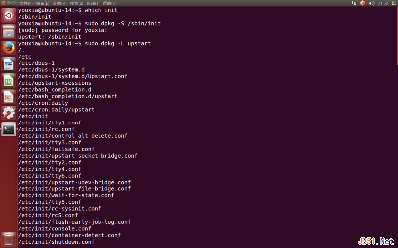 而Ubuntu属于另外一个流派。它的包管理器为dpkg。在Ubuntu中,首先,使用which init命令,可以查出init的完整路径为/sbin/init;然后使用sudo dpkg -S /sbin/init命令,可以查出init程序所在的软件包为upstart;最后,使用sudo dpkg -L upstart命令,就可以看到这个软件包里面还有哪些程序、哪些文档以及它们分别位于文件系统的什么地方了,如下图: