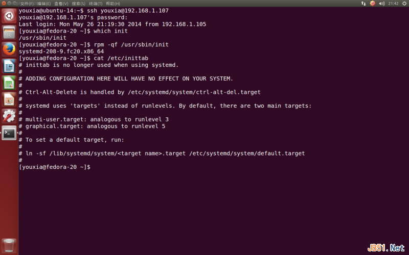 原来Fedora 20用的是systemd。使用cat /etc/inittab命令可以显示inittab文件里面的内容,从其提示可以看出Runlevel的概念早已无影无踪。由此可见,inittab、RunLevel都不是Linux本身的哲学,只是软件层面的定义而已。