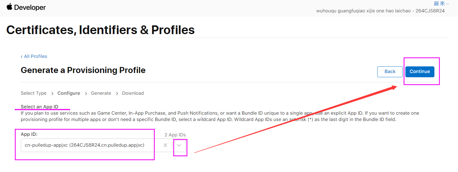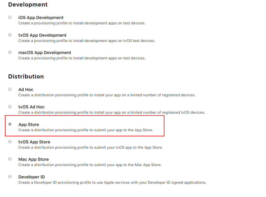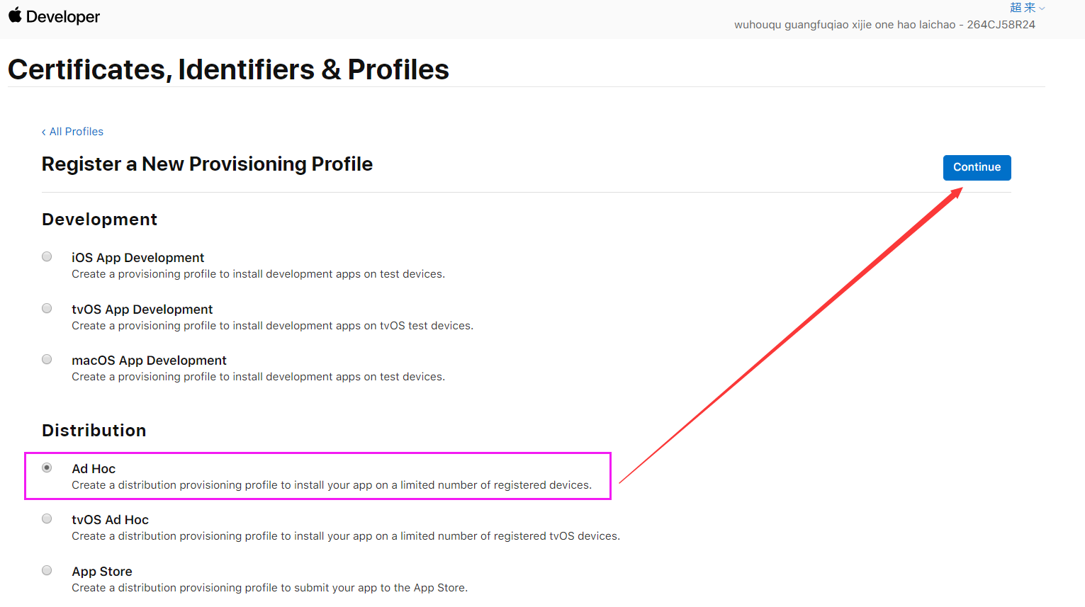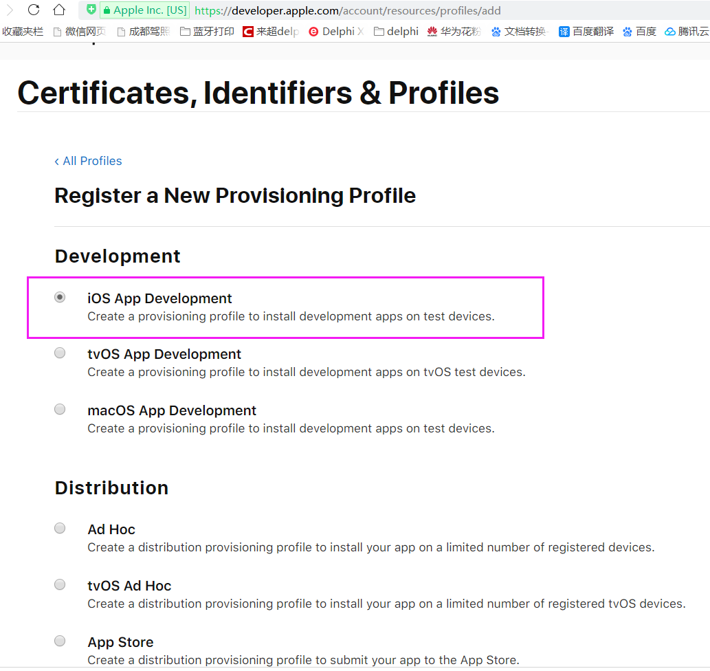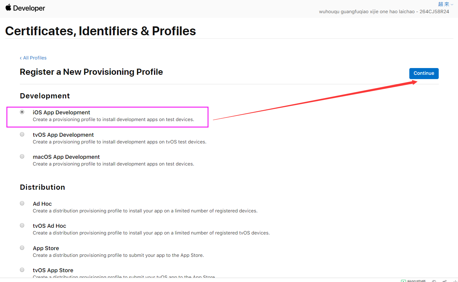 选择Profile的Type类型(包括【1】开发类App Development;App Store、Ad Hoc及Apple服务的Developer ID【2】发布类Distribution),及其对应的平台(IOS或Mac)