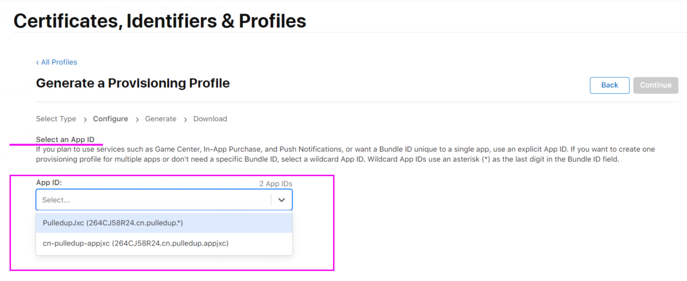 If you plan to use services such as Game Center, In-App Purchase, and Push Notifications, or want a Bundle ID unique to a single app, use an explicit App ID. If you want to create one provisioning profile for multiple apps or don't need a specific Bundle ID, select a wildcard App ID. Wildcard App IDs use an asterisk (*) as the last digit in the Bundle ID field.