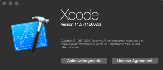 3.1.1、在你的MAC电脑或你的mac虚拟机上安装其要求的较新版的Xcode,现目前2020-06-29我安装的是Xoode版本 :version 11.5(11E608c),以换代以前的10.2.1(10E1001)版本