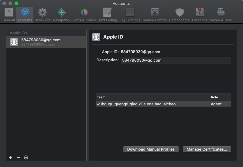 3.1.4、点中Apple ID对应的Team后,点Manage Certificates...按钮 , 打开证书管理: