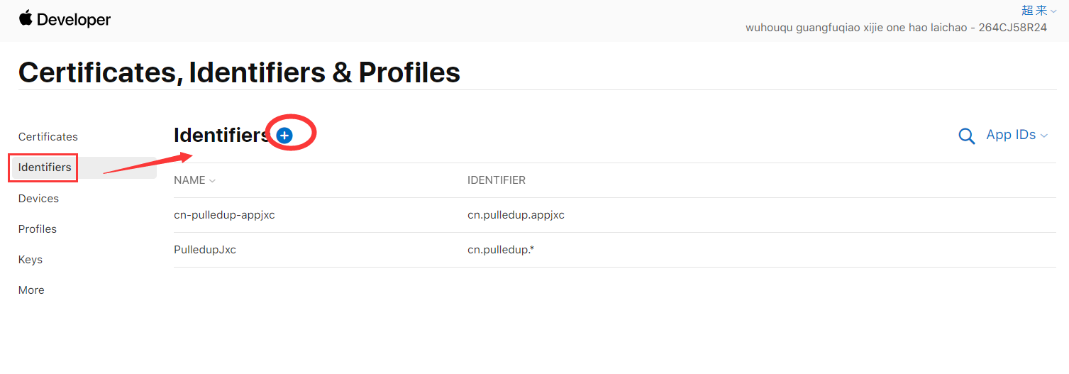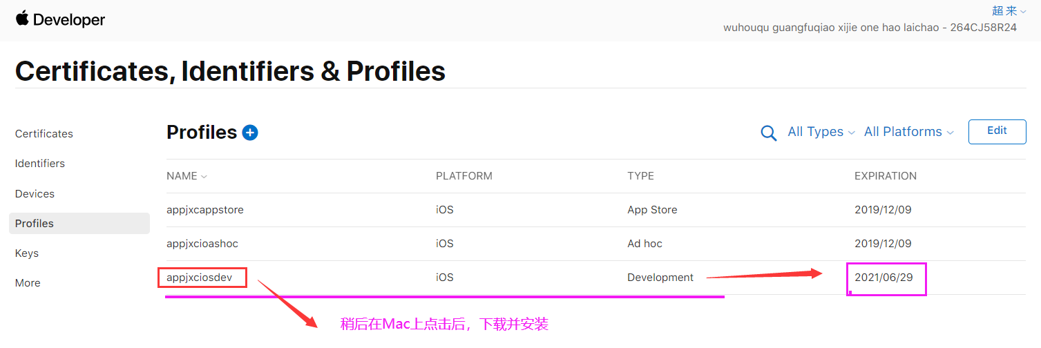 3.1.5、完成上述步骤,方可在开发者网站账户管理页面Sign In - Apple中按照步骤四、步骤五配置你的Identifiers设置App ID标识 & Profiles配置所需的开发环境: