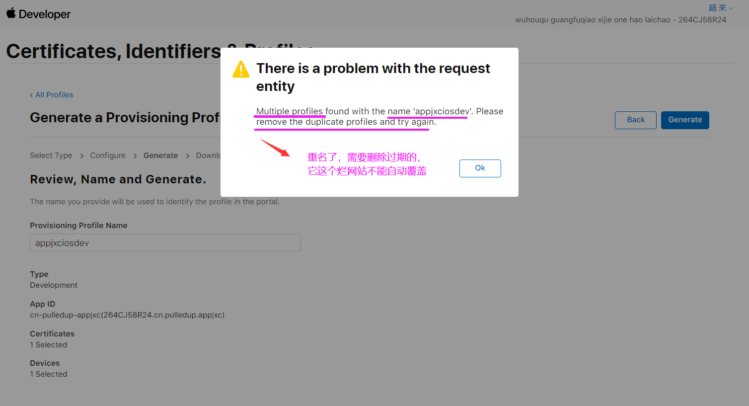 3.1、如果你的Certificates证书已过期,续费后,需要重新认证(苹果开发者网站的代码真TMD烦人,续费后证书不能自动续期),方法: