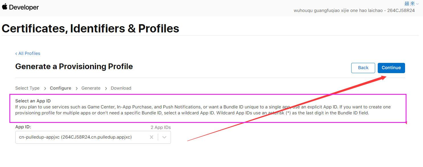如果您计划使用游戏中心、应用内购买和推送通知等服务,或希望捆绑包ID对单个应用唯一,请使用显式的应用ID。如果您要为多个应用创建一个设置配置文件或不需要特定的捆绑包ID,选择通配符应用程序ID。通配符应用程序ID使用星号(*)作为捆绑包ID字段中的最后一个数字。