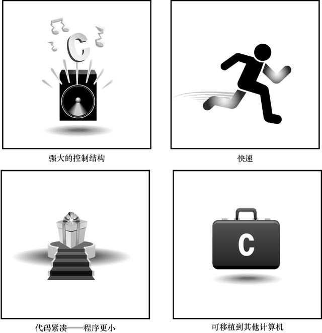 在过去40多年里,C语言已成为最重要、最流行的编程语言之一。它的成长归功于使用过的人都对它很满意。过去20多年里,虽然许多人都从C语言转而使用其他编程语言(如,C++、Objective C、Java等),但是C语言仍凭借自身实力在众多语言中脱颖而出。在学习C语言的过程中,会发现它的许多优点(见图1.1)。下面,我们来看看其中较为突出的几点。