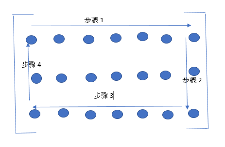 以上四步就是实现顺时针打印的思路,在这里需要注意几个特殊情况,如果给定的矩阵只有一行或者只有一列或者当外向里打印时只剩下一行或者一列,那么打印的操作就走不了完整的四步。有的只需要三步,两步,甚至一步