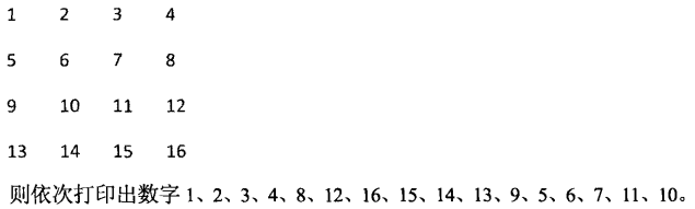 因此我们要仔细分析打印时的每一步的前提条件。第一步总是需要的,因为打印一圈至少需要一步。如果只有一行,那么就不用第二步了。也就是需要第二步的前提条件是终止行号大于起始行号。需要第三步打印的前提条件是圈内至少有两行两列,也就是说除了要求终止行号大于起始行号之外,还要求终止列号大于起始列号。同理,需要打印第四步的前提条件是至少有三行两列,因此要求终止行号比其实行号至少大2,同时终止列号大于起始列号。