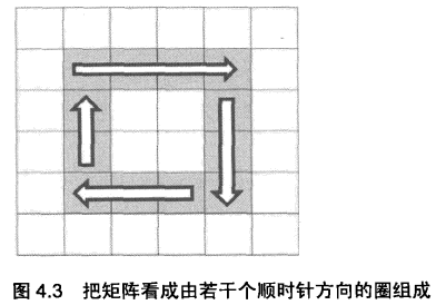 当遇到一个复杂的问题的时候,我们可以用图形来帮助我们来思考。由于是从外圈到内圈的顺序依次打印,我们可以把矩阵想象成若干个圈,如图所示。我们可疑用一个循环来打印矩阵,每一次打印矩阵中的一个圈。