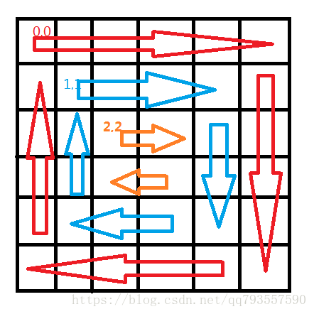 从下图可以看到,每一圈的起点,都是处于对角线上的方格。如果使用坐标来表示,第一圈的起点是(0,0)、 第二圈则从(1,1)开始,最后一圈的起点就是(2,2)。