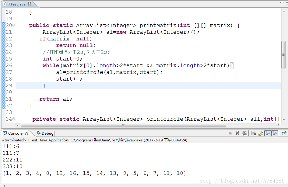 private static ArrayList<Integer> printcircle(ArrayList<Integer> all,int[][] aa, int start) {
