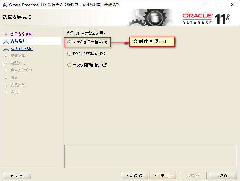 4) 选择创建和配置数据库(这样数据库安装完成后,会默认创建数据库实例orcl)