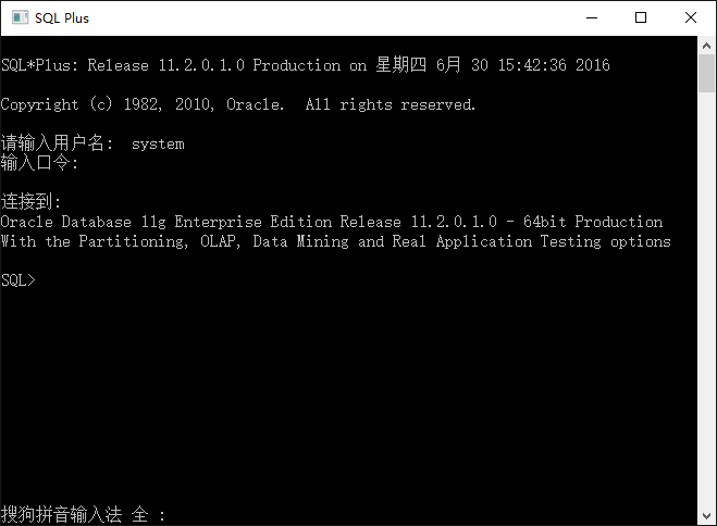 2) 运行SQL Plus,通过用户名/密码能够登录数据库,说明安装成功