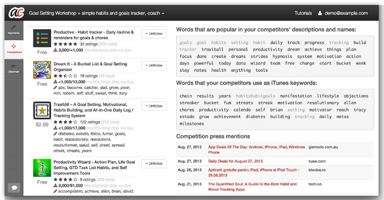 使用 AppCodes、AppTweak、SensorTower 或 Mobile Action 等工具来查找您的竞争应用程序排名的关键字,并使用 SEMRush 来发现您的利基排名中的关键字权威网站。