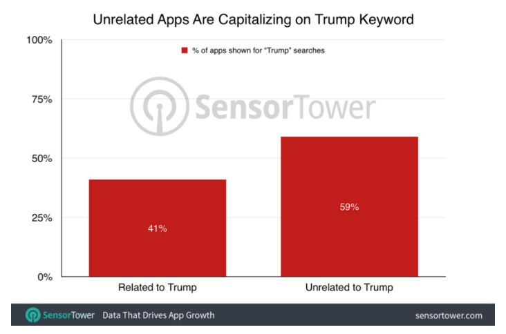 您应该考虑使用热门话题作为关键字。例如,在美国总统竞选期间,在 App Store 中搜索“特朗普”显示了 2109 个结果,搜索“希拉里”显示了 334 个结果。