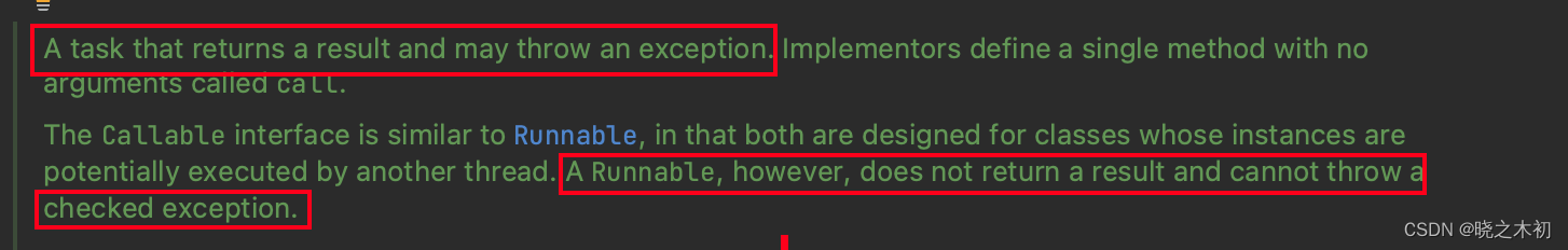 JDK源码对Callable的描述如下,同时还介绍了Callable与Runnable接口之间的差异:返回值和抛异常