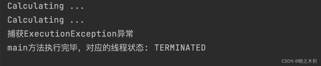 public static void main(String[] args) { // 新建线程池 ExecutorService executorService = Executors.newFixedThreadPool(2); // 提交异步计算任务 Future<Integer> future = executorService.submit(() -> { Thread.sleep(200); if (new Random().nextInt(100) < 100) { throw new RuntimeException("任务执行过程中,遇到未知异常"); } Thread.sleep(200); return 200; }); Thread mainThread = Thread.currentThread(); executorService.submit(() -> { try { // main线程中,轮询future任务的状态 while (!future.isDone()) { System.out.println("Calculating ..."); Thread.sleep(100); } System.out.println("执行结果:" + future.get()); return 0; // 表示成功获取计算结果 } catch (CancellationException | ExecutionException | InterruptedException e) { // 将get()方法有关的异常都进行显式处理 System.out.println("捕获" + e.getClass().getSimpleName() + "异常"); System.out.println("main方法执行完毕,对应的线程状态: " + mainThread.getState()); return -1; // 表示获取计算结果失败 } }); } -