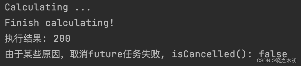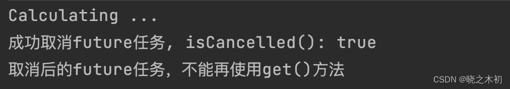 CancellationExceptionpublic static void testFuture6() throws InterruptedException, ExecutionException { // 新建线程池 ExecutorService executorService = Executors.newSingleThreadExecutor(); Future<Integer> future = executorService.submit(() -> { System.out.println("Calculating ..."); Thread.sleep(500); System.out.println("Finish calculating!"); return 200; }); // 一段时间后,强制取消future task Thread.sleep(300); boolean return_flag = future.cancel(true); if (return_flag) { System.out.println("成功取消future任务, isCancelled(): " + future.isCancelled()); } // 取消后的future任务,isDone()始终返回true;但是,通过get()获取执行结果,将抛出CancellationException try { if (future.isDone()) { System.out.println("执行结果: " + future.get()); } } catch (CancellationException e) { System.out.println("取消后的future任务,不能再使用get()方法"); } } -