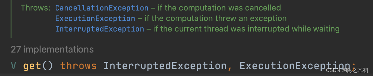CancellationException:future任务被成功取消后,通过get()方法获取执行结果时,将会触发该异常ExecutionException:future任务在执行的过程中抛出了异常,通过get()方法获取执行结果时,将会触发该异常InterruptedException:调用get()方法等待执行结果时,所在的线程被中断,将会触发该异常