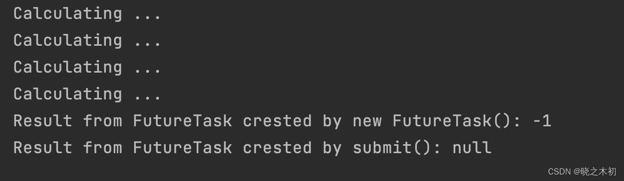Future<?> submit(Runnable task);// 新建线程池 ExecutorService executorService = Executors.newSingleThreadExecutor(); try { // 提交Callable任务 FutureTask<Integer> futureTask = new FutureTask<>(() -> { System.out.println("Calculating ..."); Thread.sleep(1000); return -1; }); Future<?> submit = executorService.submit(futureTask); // 直接通过futureTask获取future结果 while (!futureTask.isDone()) { System.out.println("Calculating ..."); Thread.sleep(500); } System.out.println("Result from FutureTask crested by new FutureTask(): " + futureTask.get()); // 2. 而通过submit()创建的另一个FutureTask,其结果为null System.out.println("Result from FutureTask crested by submit(): " + submit.get()); } catch (ExecutionException | InterruptedException e) { throw new RuntimeException(e); } finally { executorService.shutdown(); } -