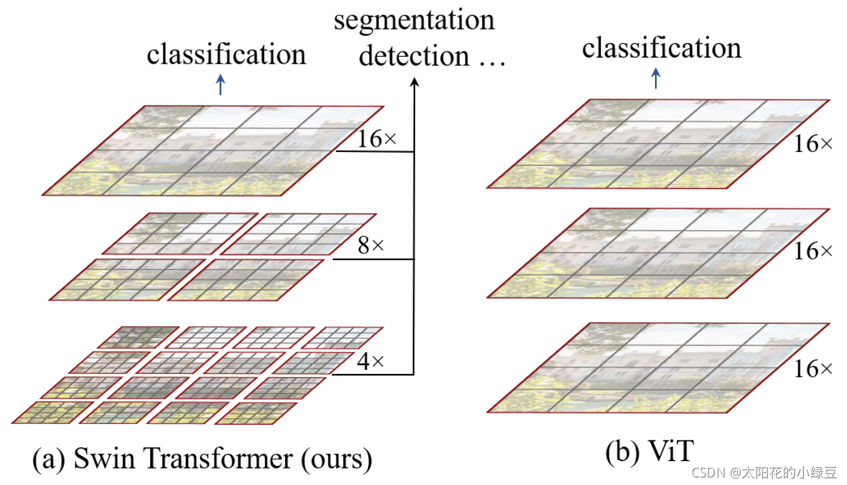 下图是Swin Transformer文章中给出的图1,左边是本文要讲的Swin Transformer,右边边是之前讲的Vision Transformer。