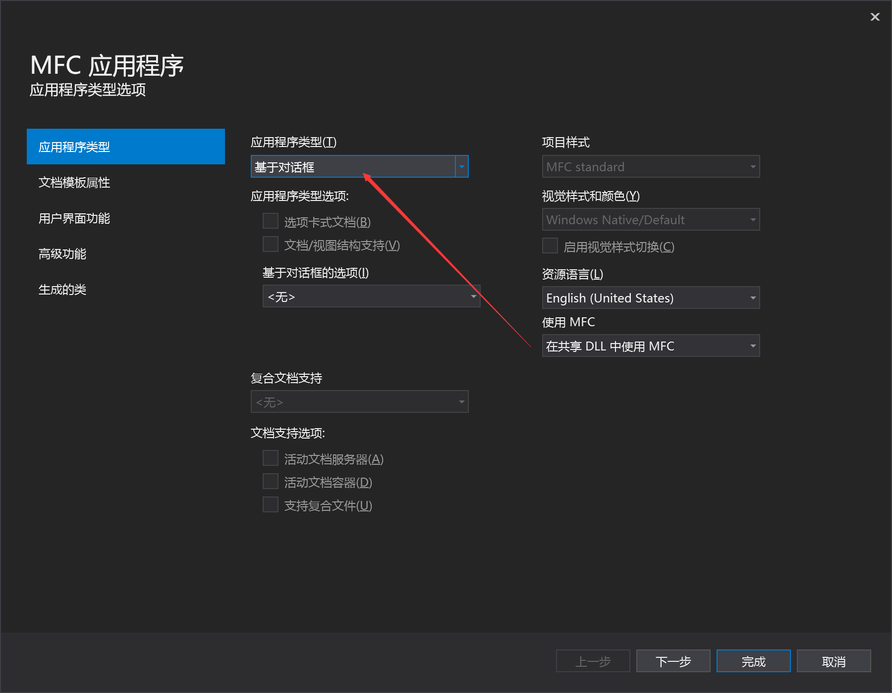 下一步,应用程序类型->基于对话框,其它默认