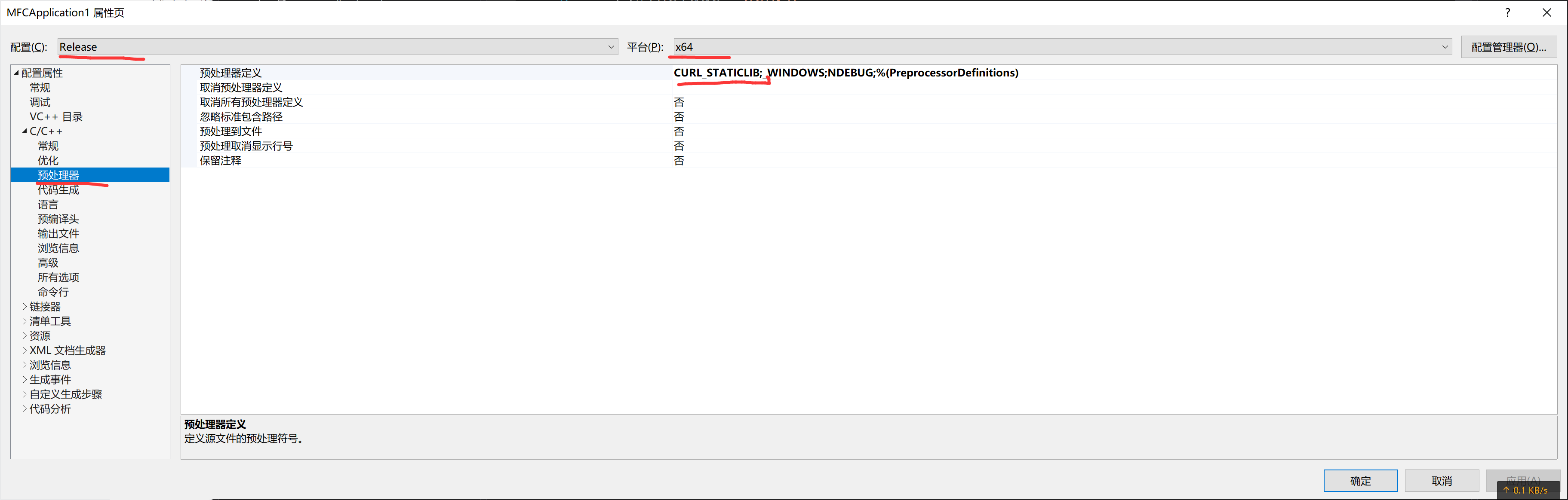 3、本项目静态编译,所以需要将CURL_STATICLIB添加至工程。选择C/C++->预处理器->预处理器定义:添加CURL_STATICLIB