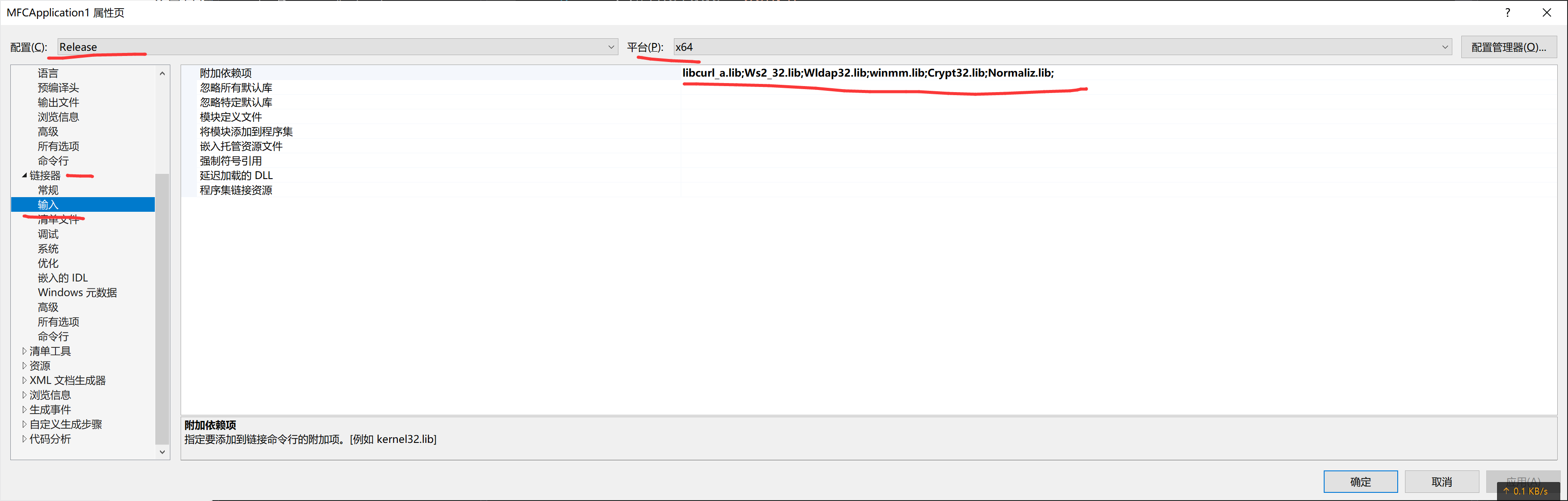 链接器->输入->附加依赖项:添加libcurl_a.lib;Ws2_32.lib;Wldap32.lib;winmm.lib;Crypt32.lib;Normaliz.lib;