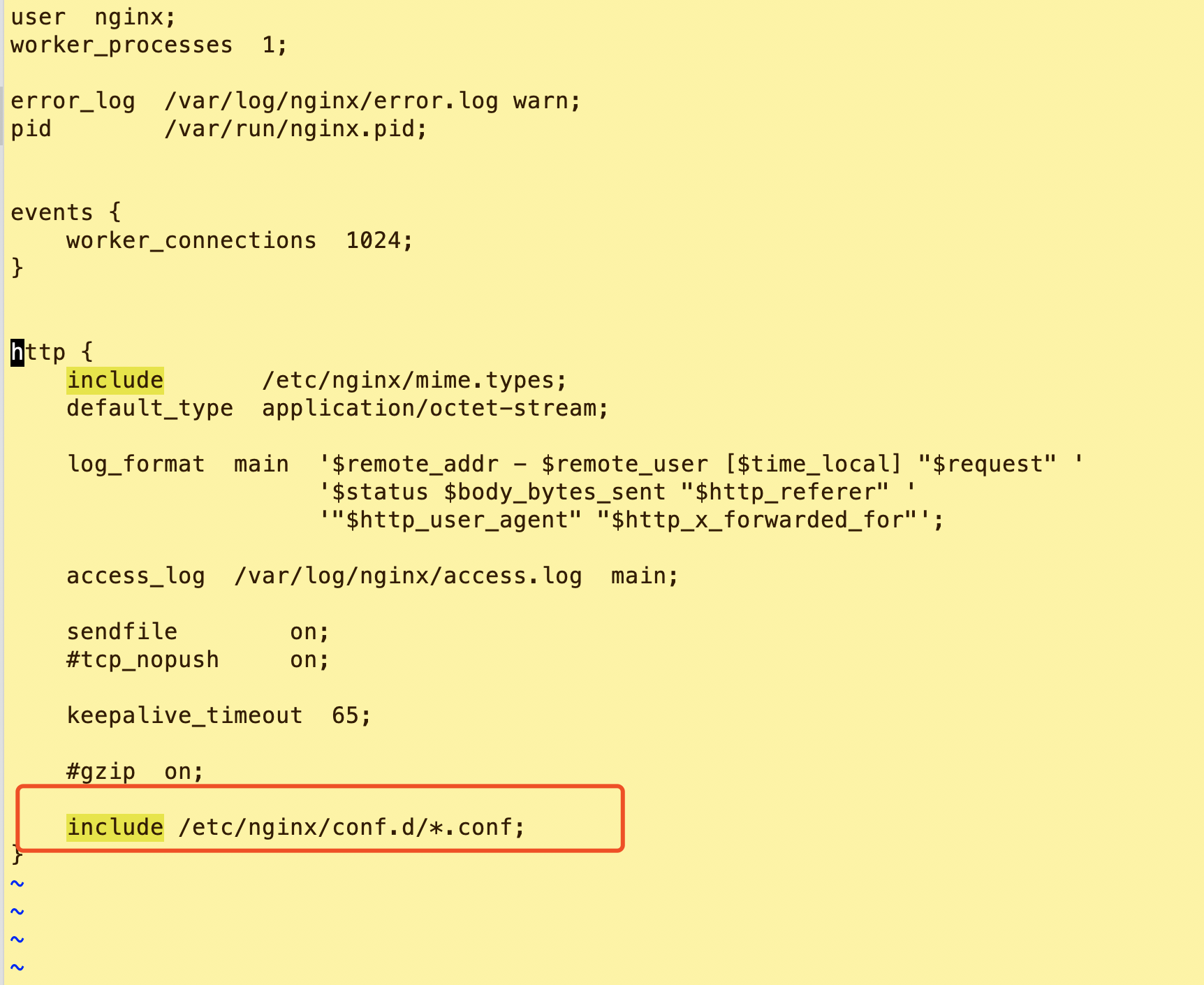 其中最后一句:include /etc/nginx/conf.d/*.conf;这包含了conf.d下面的default.conf