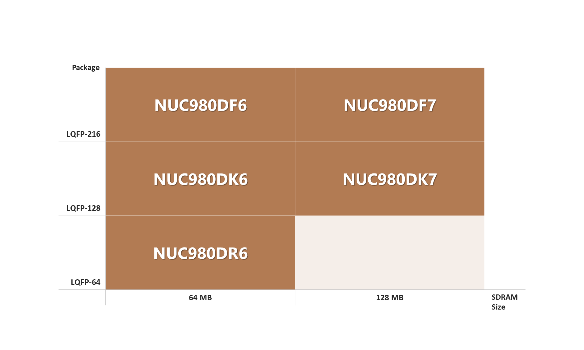 The NUC980DK61YC series with the ARM926EJ-S core can operate at up to 300 MHz . It offers 128-pin LQFP packages stacked with 64 MB DDR-II Memory to reduce PCB size and EMI issues. Rich peripherals include 10 sets of UART , 2 sets SDIO / eMMC interface, 8 Ports USB Host, NAND Flash interface, QSPI NAND ,4 sets CAN, 2 sets 10 / 100 Mbps Ethernet MAC and High-Speed USB 2.0 host / device controller to allow more flexibility in designs. The NUC980DK61YC also supports industrial temperature from - 40 ℃ to 85 ℃ and targets Ethernet and IoT Control.