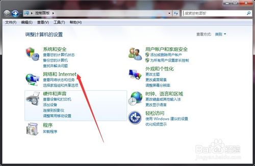 1、在开始菜单内找到控制面板,单击打开;然后找到网络和Internet,单击打开
