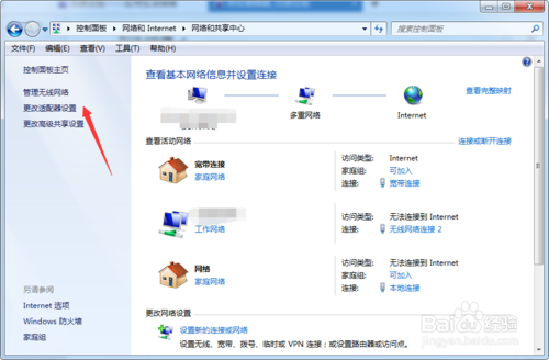 2、下一步找到网络和共享中心,单击打开;进去在左边打开更改适配器设置