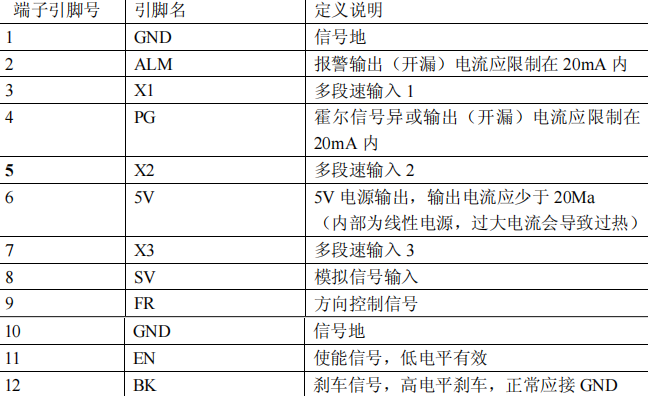EN是低电平使能信号;GND是信号地;FR是方向控制信号,高低电平控制正反转;SV是PWM输入端,该 PWM 输入信号的占空比可为 0 到 100%任意值, PWM 频率应在 1KHz-20KHz 之间,频率偏向低则 PWM 精度高;BK是刹车信号,低电平刹车。
