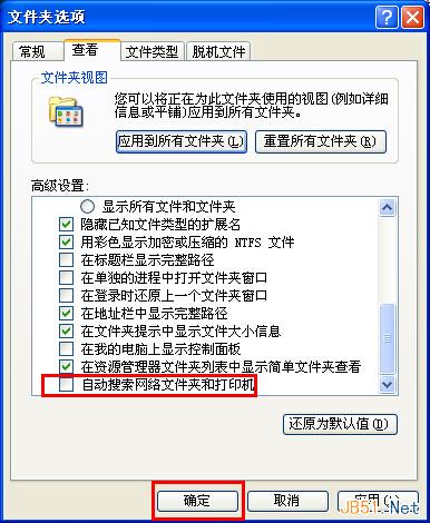 3.重启电脑后,双击“我的电脑”选择 “工具”—“文件夹选项”—“查看”,将“自动搜索网络文件夹和打印机”的勾选取消;