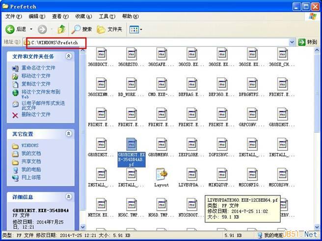 6.进到c盘C:\WINDOWS\Prefetch文件夹,将扩展名为pf的文件全部删除,重启xp系统计算机即可;如下图所示: