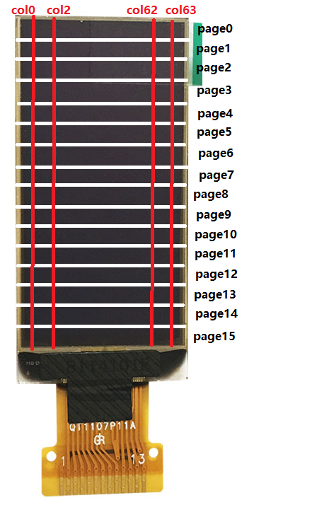 ② OLED屏对应的全部显示地址列表,16页对应page0-page15,64列对应col0-col63,如下图: