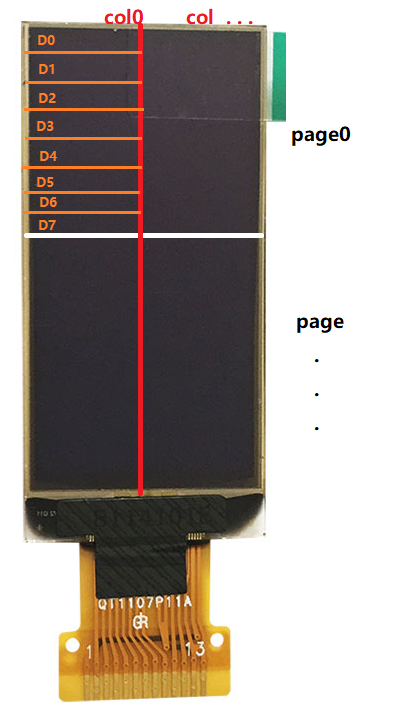 ③ OLED屏对应的8192(64*128)个像素点,每一页里每一列都为D0-D7的8个点,程序里点亮的话也是8位数据传输,如下图: